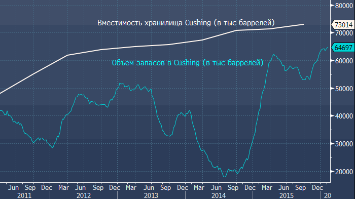 Запасы сырой нефти в Кушинге снижались с середины апреля до конца сентября 2015 года, затем в течение месяца оставались, примерно, неизменными, после чего начался их уверенный рост. Это возродило широкие опасения того, что в скором времени хранилище окажется полностью заполненным, так как на данный момент свободного места осталось всего для 8 млн баррелей.