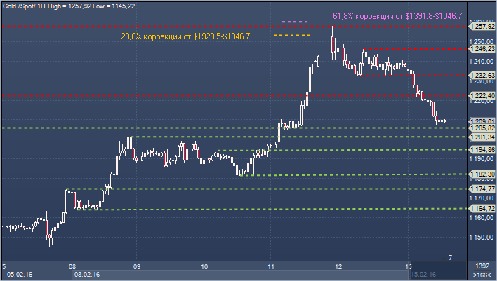 Комментарий: в прошлый четверг мы увидели, что ралли золота достигло апогея — быкам удалось достичь и протестировать 61,8% коррекции Фибоначчи на $1260.0. Последовавший затем логический откат сопровождался потерей поддержки на $1230.4. Это, вероятно, добавит давления, инициировав начало приличной коррекции роста с $1071.8, минимума 14 января. Следующая область поддержки отмечена на часовом графике в районе прежнего максимума, достигнутого 8 февраля на уровне $1200.5. И дальнейшие потери только усилят нисходящий импульс. Между тем, сопротивление теперь сосредоточено в области $1222.4-$1238.2. Источник: ProFinance.Ru - Новости рынка Forex