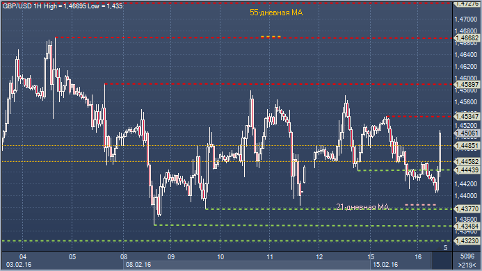 Сопротивление 2: $1.4485 - часовое сопротивление 15 февраля (тестируется)