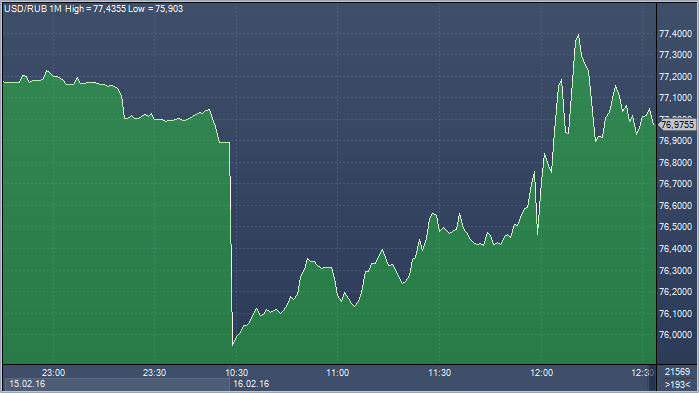 Доллар США, падавший утром на "Московской бирже" примерно на 1 рубль, развернулся к росту после сообщения об итогах встречи. Доллар взлетал до 77.28 руб./$1 в 12.07 мск, прибавив 33 копейки к отметке предыдущего закрытия. За несколько минут рост доллара составил более 50 копеек. Курс евро при этом также резко вырос, достигнув 86,52 руб./EUR1 (+72 копейки). Сразу после сообщения нефть Brent, поднимавшаяся до $35,5 за баррель, устремилась вниз, цены ушли ниже $34 за баррель. Источник: ProFinance.Ru - Новости рынка Forex