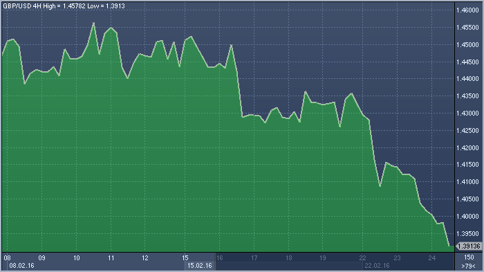 Фунт/доллар прорвался ниже январского минимума $1.4083 и теперь нацелен на тест минимума 2009 года около $1.3500. Продавайте на росте к $1.4130-$1.4225 с целью $1.35 и, возможно, $1.2750;