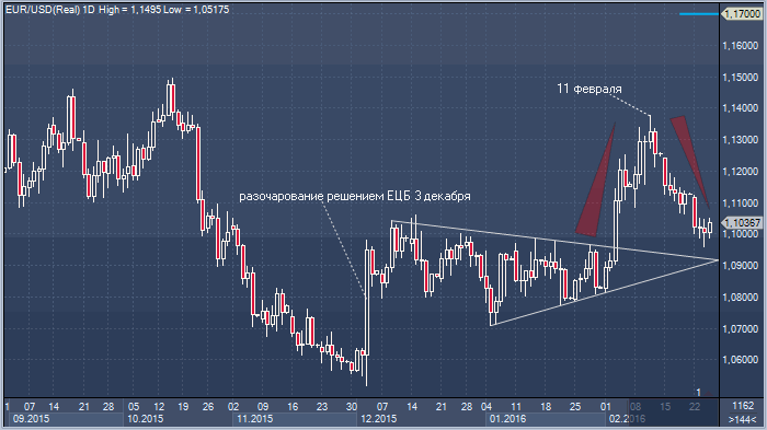Что любопытно, рынок очень уверен, что решения ЕЦБ в марте приведут к дальнейшей слабости евро. Но стоит заметить, что в этом году агрессивные монетарные решения, которые предпринимались Банком Японии и Центробанком Швеции, включавшие введение отрицательнных процентных ставок, нашли отражение лишь в минутной слабости соответствующих валют в качестве реакции на такие решения. Но рынок, очевидно, приписывает решениям ЕЦБ более высокий рейтинг.