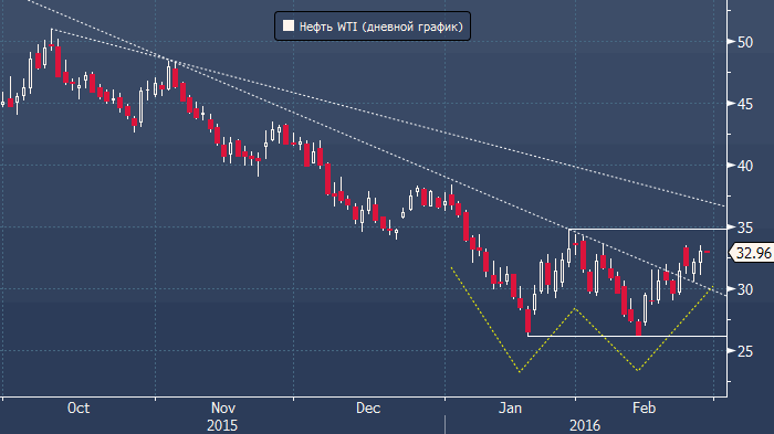 При таком фоне в ценах преобладает исключительно техническая торговля. Котировки фьючерсов на нефть марки WTI в январе и феврале сформировали двойное дно в районе 26.19 доллара за баррель. Теперь мы движемся наверх попросту потому, что вниз пройти не удалось. На верхней стороне ключевым уровнем сопротивления, очевидно, выступает отметка 35 долларов за баррель. Если она устоит, то мы будем двигаться вниз по той же технической причине, а не в связи с фундаментальными переменами. Очевидно, что для пробития той или иной границы установленного коридора 26 — 35 не хватает движущей силы со стороны фундаментальных факторов. Текущие драйверы не способны, ни вызвать рост выше 35, ни спровоцировать падение ниже 26 долларов за баррель.