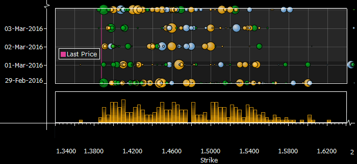 | Как пользоваться графической информацией, представленной ниже? На графиках в виде кругов, размер которых зависит от объема, представлены страйки опционов (по оси Х), срок истечения которых наступает в указанную дату (ось Y). Голубой цвет — Call. Зеленый цвет — Put. Желтый цвет — Mixed C/P. Источник данных: Депозитарная Трастовая и Клиринговая Корпорация (DTCC). Просьба свои замечания и пожелания относительно формата и содержания предоставляемой на сайте аналитической информации направлять по адресу: analytics@forexpf.ru |