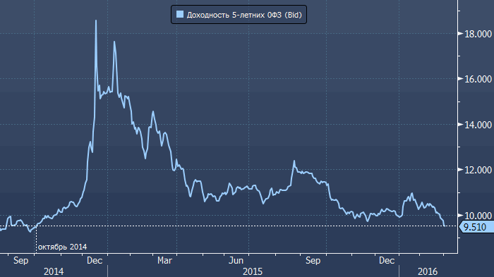 Доходность российских государственных облигаций находится на 17-месячных минимумах, что отражает отчасти растущую вероятность более скорого сокращения ключевой ставки Банком России. Сам факт снижения ключевой ставки является негативным для рубля фактором, однако при условии стабилизации цен на нефть и снижения волатильности российской валюты это может стимулировать спрос иностранных инвесторов на рублевые долги в рамках стратегии carry trade. А это уже, несомненно, позитивный момент для российской валюты, так как для приобретения ОФЗ (облигации федерального займа) иностранцам потребуется покупать рубль. Как видим, доходность 5-летних ОФЗ находится на минимумах с октября 2014 года.