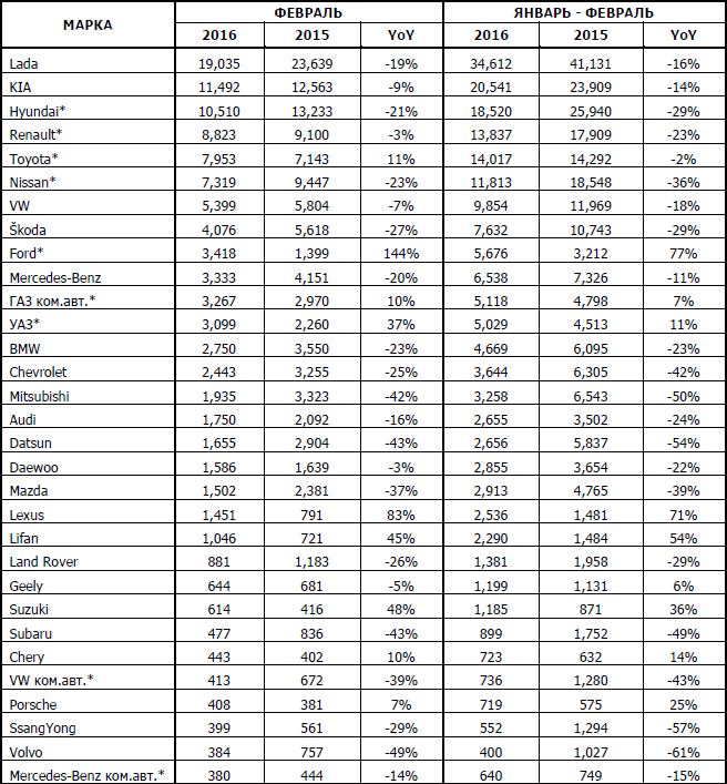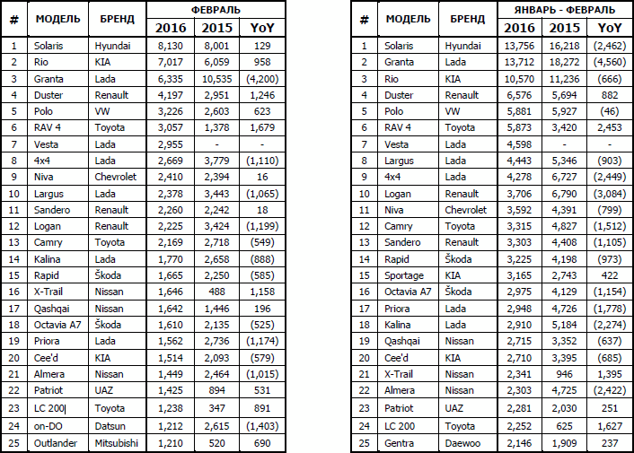 Комитет автопроизводителей Ассоциации Европейского Бизнеса (АЕБ) опубликовал данные по продажам в России новых легковых и легких коммерческих автомобилей за февраль 2016 года. Согласно опубликованным данным, февраль текущего года ознаменовался падением уровня продаж на 13.4%, или на 17 232 штук по сравнению с февралём 2015 года, что составило 111 145 автомобилей. Девять моделей из десятки лидеров продаж новых легковых автомобилей, местного производства.