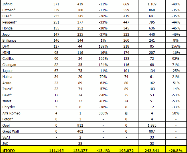 Продажи новых легковых и легких коммерческих автомобилей в России по маркам авто. Данные включают как импортированные, так и автомобили отечественной сборки. Сортировка в таблице по результатам продаж за месяц.
