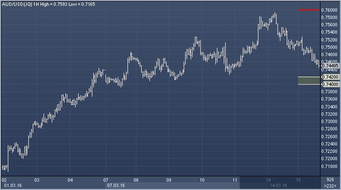 Вчерашнее быстрое падение аусси/доллара с максимума $7595 (лишь немногим ниже нашей цели $0.7600) предупреждает о том, что текущая бычья фаза, возможно, приближается к концу. Тем, у кого открыты длинные позиции по паре, мы рекомендуем продавать на любых попытках роста к $0.76 и поднять стопы с $0.7400 до $0.7420. Источник: ProFinance.Ru - Новости рынка Forex