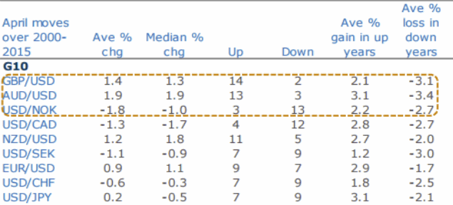 Эксперты Australia and New Zealand Banking Group (ANZ), тщательно отслеживающие сезонные аспекты динамики валютных курсов, отмечают, что доллар США в апреле имеет склонность к ослаблению. Это наиболее выраженно в слабости американской валюты против: 1) австралийского доллара (long AUDUSD в течение апреля); 2) фута стерлингов (short GBPUSD в апреле); 3) норвежской кроны (short USDNOK в апреле).