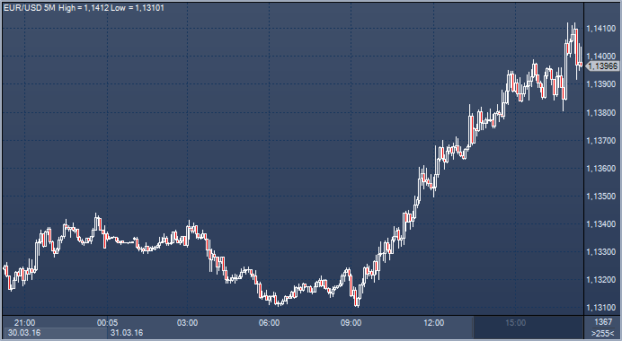 Курс доллара США снизился против евро до минимального уровня за последние пять месяцев на фоне новых намеков на нескорое повышение ставок в Штатах и перераспределения денежных потоков в связи с окончанием месяца. Валюта может показать худший квартальный результат за последние пять лет. Единая европейская валюта готовится продемонстрировать квартальный подъем на 4,7 %. Глава Федерального резервного банка Чикаго Чарльз Эванс заявил только что, что точные сроки повышения ставок не имеют большого значения. "Вероятно, повысим ставки в середине года, а затем - в конце года. Меня устраивает сценарий, предполагающий два повышения ставки в 2016 г", - заявил он, добавив при этом, что экономика "близка" к полной занятости. Он также сказал, что не хочет, чтобы ФРС оказалась в ситуации, когда ей придется применить отрицательные ставки. После этих комментариев курс евро к доллару вышел на новые максимумы, преодолев планку в $1.14.