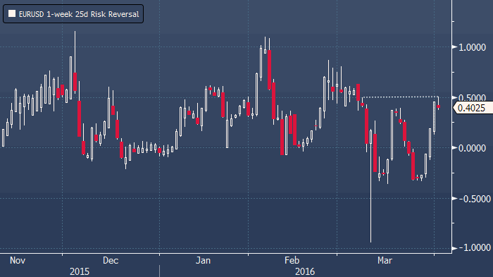 Курс евро/доллар вчера сформировал максимумы в районе 1.1411 после чего последовала коррекция в область 1.1365. В настоящий момент рынок ожидает публикацию отчета по рынку труда в США за март, однако цены в данной валютной паре вновь вернулись к атаке на фигуру 1.1400. Настроения рынка за эту торговую неделю существенно сместились в пользу единой европейской валюты. Недельный показатель Risk Reversal, рассчитываемый как разница в ценах опционов Call и Put с дельтой 25%, достиг 50 базисных пунктов, что является максимальным значением с 7 марта. Напомним, что значение показателя выше нулевой отметки сигнализирует увеличение бычьих настроений в отношении евро (EUR Call USD Put) и наоборот.