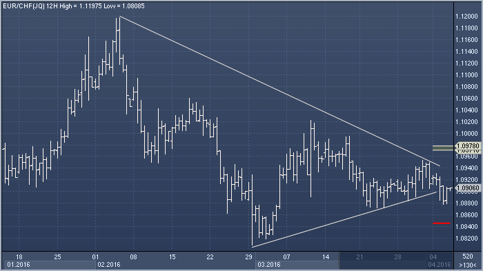 Евро/франк сломал краткосрочный аптренд и теперь находится под давлением, пытаясь выйти вниз из симметричного треугольника. До тех пор, пока пара торгуется ниже chf1.0971 (55-дневная МА) / chf1.0978 (краткосрочный даунтренд), мы ждем снижения к chf1.0846 (200-дневная МА) и chf1.0737 (минимум прошлого ноября). Источник: ProFinance.Ru - Новости рынка Forex