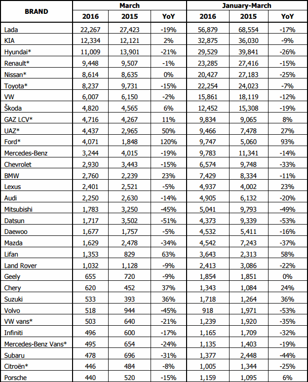 Комитет автопроизводителей Ассоциации Европейского Бизнеса (АЕБ) опубликовал данные по продажам в России новых легковых и легких коммерческих автомобилей за март 2016 года. Согласно опубликованным данным, первый месяц весны текущего года ознаменовался падением уровня продаж на 10%, или на 13 968 штук по сравнению с мартом 2015 года, что составило 125 917 автомобилей. Девять моделей из десятки лидеров продаж новых легковых автомобилей, местного производства. В общей сложности в этом году в период с января по март было продано 319 092 автомобилей. «Результат мартовских продаж показывает, что в целом автомобильный рынок в России не в лучшей форме. Улучшение ситуации зависит от стабильности макроэкономической среды и усилий властей по стимулированию спроса», - прокомментировал ситуацию Йорг Шрайбер, председатель Комитета автопроизводителей Ассоциации Европейского Бизнеса. Данные за февраль можно посмотреть тут.
