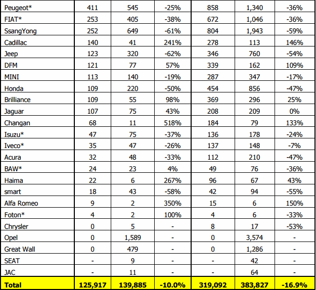 Продажи новых легковых и легких коммерческих автомобилей в России по маркам авто. Данные включают как импортированные, так и автомобили отечественной сборки. Сортировка в таблице по результатам продаж за месяц.