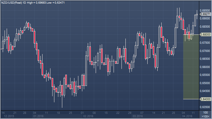 В январе киви/доллар опустился до четырехмесячного минимума $0.6350 и с тех пор неторопливо корректировался выше. Несмотря на неожиданное снижение ключевой ставки на 0.25% на мартовском заседании РБНЗ, к концу месяца пара поднялась до девятимесячных максимумов чуть ниже $0.70 на фоне «голубиных» комментариев представителей FOMC. Более того, глава РБНЗ и его зам постоянно говорят о том, что монетарная политика в стране должна оставаться стимулирующей ввиду серьезного снижения двухлетнего прогноза по инфляции с начала года. Экономика Новой Зеландии все еще выглядит сильной: цифра по ВВП в четвертом квартале превысила прогнозы, а торговый баланс улучшился после роста объемов экспорта, однако цены на молоко остаются низкими. В соответствии с нашим базовым прогнозом, FOMC повысит ставки на июньском заседании, после чего киви/доллар подешевеет до $0.64. Затем, на фоне восстановления инфляционных ожиданий в Новой Зеландии, к концу 2016 года пара подрастет до $0.68. Источник: ProFinance.Ru - Новости рынка Forex