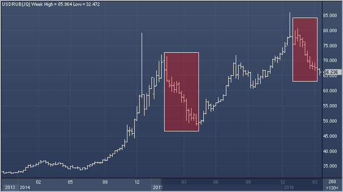 В этом году, как и в прошлом, рубль укрепляется накануне прямой линии Владимира Путина, являясь лидером роста среди основных валют по результатам последних трех месяцев. «Прямая линия рассчитана на основную часть населения и призвана успокоить людей», - считает Лиза Ермоленко из Capital Economics. – «Я бы не придавала ей большого значения. Маловероятно, чтобы в будущем рубль продолжил расти так же стремительно. Главным драйвером динамики рубля остаются цены на нефть, которые по нашим прогнозам, завершат год на текущих значениях». Отметим, что, в соответствии с медианным прогнозом 45 аналитиков, опрошенных Bloomberg, к концу квартала доллар/рубль вернется к отметке 70. Источник: ProFinance.Ru - Новости рынка Forex