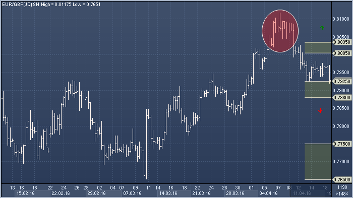 После неплохого роста первой недели апреля евро/фунт корректируется и пытается удержаться выше области поддержки stg0.7925-0.7880. Прорыв ниже будет означать, что важная вершина сформирована, предполагая продолжение относительной слабости единой валюты и высокую вероятность возвращения кросса к следующей поддержке stg0.7750- stg0.7650. Прорыв ближайшего сопротивления stg0.8005-35 подаст сигнал о том, что среднесрочный аптренд с минимумов июля 2015 года около stg0.6935 сохраняет силу, однако лишь взятие сопротивления stg0.82 отменит все медвежьи сценарии и откроет дорогу для дальнейшего роста к stg0.84 и stg0.87. Источник: ProFinance.Ru - Новости рынка Forex