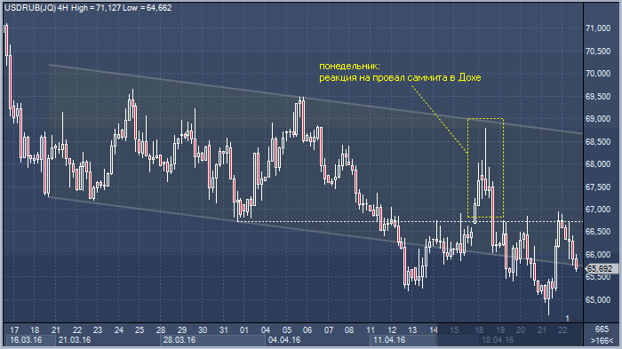 И, действительно, переговоры в столице Катара завершились безрезультатно. Нефть на открытии текущей недели в понедельник отреагировала снижением, а рубль дешевел к американской валюте. Но в тот же понедельник к завершению торгового дня нефть смогла восстановить потери, а рубль по итогам первого торгового дня недели укрепился к валюте США. Затем вторник и среду нефтяные котировки продолжали рост, а курс рубля укреплялся к американской валюте. Лишь в четверг (вчера) российская валюта снова оказалась под давлением, но уже сегодня, как видно, рубль снова укрепляется.