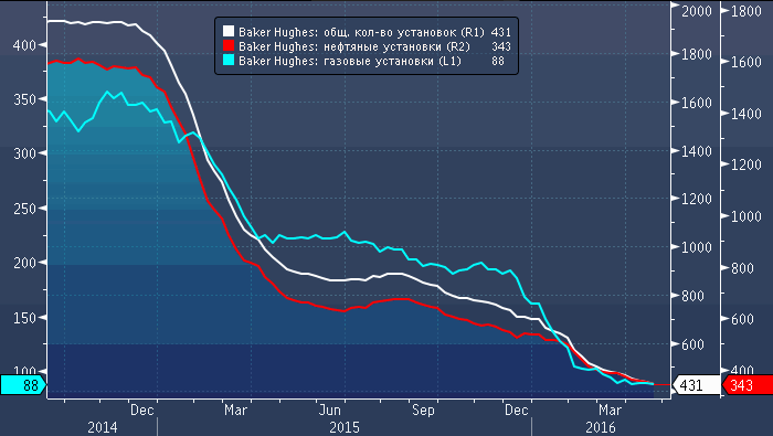 Baker Hughes: количество активных нефтяных установок за неделю до 22 апреля сократилось на 8 до 343 установок
