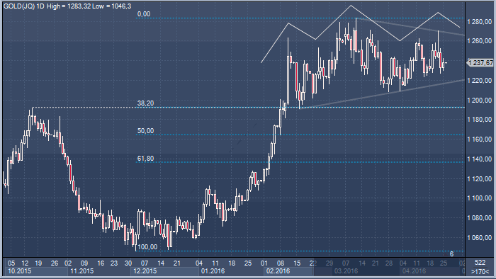 Ниже представлен дневной график спот-цен на золото. Многолетний медвежий тренд золота в середине декабря 2015 года сформировал дно и с тех пор мы наблюдаем восходящее ралли, которое начало немного «пробуксовывать» с марта месяца.