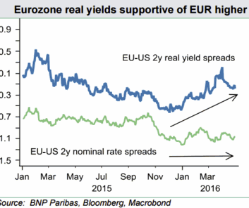 Аналитики BNP Paribas отмечают, что падение потребительской инфляции до -0.2% г/г было созвучно более слабым данным из Испании и Германии, опубликованным ранее, а также соответствовало ожиданиям экономистов банка. В то же время темпы роста ВВП Еврозоны в первом квартале выросли до 0.6% кв/кв, оказавшись чуть выше, чем ожидало большинство участников рынка. В BNP Paribas отмечают, что комбинация низкой инфляции и спада надежд на смягчение политики ЕЦБ означает, что, в то время как номинальные ставки остаются на прежних уровнях, реальные ставки в Еврозоне растут. Подобное развитие событий подкрепляет мнение аналитиков в потенциале для роста евро/доллара — в BNP Paribas сохраняют лонг от $1.1290 с целью на $1.16. В банке отмечают, что, хотя ЕЦБ на прошлой неделе просигнализировал о том, что он готов пойти на дальнейшее смягчение политики, обстановка на финансовых рынках и данные из Еврозоны не дают повода ожидать такового в ближайшее время. Кроме того, более вероятным видится расширение программы покупки активов, а не снижение ставок. Источник: ProFinance.Ru - Новости рынка Forex