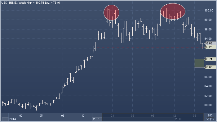 Вчера Индекс доллара, основной вес в котором имеет евро, краткосрочно нырял ниже ключевой области поддержки 92.62-25, однако там быстро нашлись покупатели. Теперь американская валюта нацелена на тест ближайшего сопротивления 93.92, однако лишь прорыв выше 95.20 позволит говорить о формировании краткосрочного дна. Впрочем, учитывая слабость месячного MACD, риски дальнейшего снижения остаются довольно высокими. Прорыв ниже отметки 92.25 закончит формирование большой двойной вершины и создаст предпосылки для теста областей поддержки 89.71 и 89.62-12 (коррекция 38.2% от всего роста с минимумов 2008 года). Вероятно, Индексу удастся устоять во время первого теста этой области, однако прорыв ниже нацелит его на снижение к 40-недельной МА около 88.00. Источник: ProFinance.Ru - Новости рынка Forex