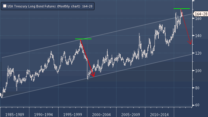 Что же мы наблюдаем в настоящий момент? На этот раз у нас была восходящая коррекция от 1.0458 до 1.1714. Несколько недель назад мы придерживались мнения, что нас еще ожидает окончательная попытка восходящего движения с целью тестирования 1.2000, но удержаться выше 1.1500 не удалось и, кажется, у нас наметился разворот. Минимумы 1.0458 были достигнуты в марте 2015 года. То есть в данный момент с тех пор прошло 14 месяцев. При этом на рынке казначейских облигаций в США также наметился разворот (дежавю?).