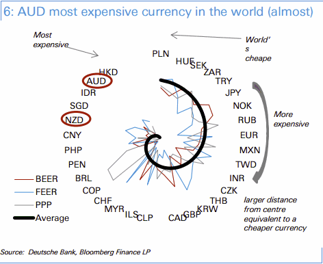 Следует признать, австралийский доллар потерял много драйверов в последнее время. Однако позиционирование рынка на IMM по сальдо длинных и коротких позиций остается в плюсе (нетто-лонг). Представленная ниже диаграмма показыает, что среди основных валют австралийский доллар остается наиболее переоцененным. В целом мы уверены, что текущие уровни цен в паре аусси/доллар остаются привлекательны для входа в короткие позиции.