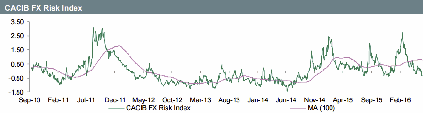 Валютный стратег Credit Agricole Мануэль Оливери обращает внимание на то, что за последнее время волатильность на финансовых рынках заметно снизилась, а кредитные спреды сузились. Кроме того, в среде инвесторов ослабло и беспокойство по поводу возможности выхода Великобритании из ЕС по итогам референдума, который намечен на 23 июня. Еще одним позитивным сигналом, по словам Оливери, является улучшение динамики на рынке акций, в частности в части бумаг банков, которые, как правило, болезненно реагируют на приступы нервозности в инвестиционном сообществе. Оливери отмечает, что индекс риска, рассчитываемый Credit Agricole с -0.03 на прошлой неделе сегодня достиг -0.33 пункта, что дает повод ожидать дальнейшего улучшения динамики рисковых валют. В Credit Agricole полагают, в частности, что привлекательной выглядит покупка фунт/франка - в британце по-прежнему заложена премия за риск, связанный с референдумом. Источник: ProFinance.Ru - Новости рынка Forex