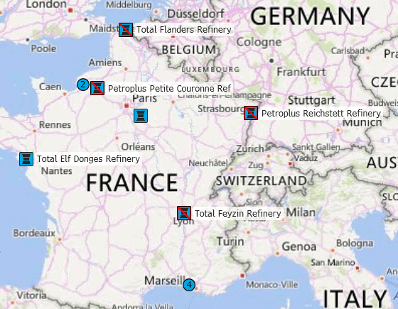 4 - НПЗ Total La Mede и НПЗ Ineos Lavera (забастовка повлияла на работу), НПЗ Exxon Mobile Fos и НПЗ LyondellBasell Berre (работают)