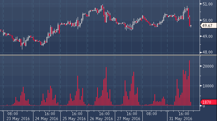 Неспособность покорить максимумы прошлой недели и слухи о том, что ряд нефтяных компаний проявляет интерес к хеджированию будущих поставок обернулось фиксацией прибыли, принявшей весьма резкий характер: от уровней выше $50.80, нефть рухнула к отметке $49.57, неподалеку откуда и остается в настоящее время. Объем торгов оказался весьма значительным, и, хотя трейдеры отмечают, что его пик пришелся на уровни, близкие к минимумам сессии, настрой остается подавленным. Краткосрочная техническая картина оказалась подпорчена, и фокус теперь смещен к поддержке в районе 49.34/19 ( минимумы 27/05 и 23.6% от майских минимумов), прорыв ниже которой будет предполагать формирование локальной вершины и риски более глубокой коррекции. Источник: ProFinance.Ru - Новости рынка Forex
