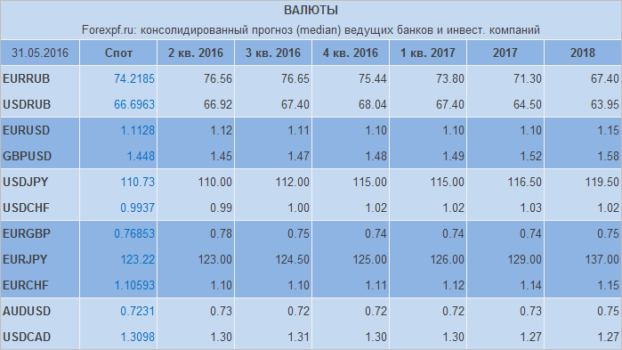 Представляем вашему вниманию таблицу консолидированных прогнозов (median), актуальных на текущую дату (позволяют оценить настроения рынка и обозначают «средний градус по больнице»). Расчет медианного значения включает лишь те прогнозы крупных банков и инвестиционных компаний, которые были опубликованы не позднее 3 месяцев от текущей даты. Однако по статистике превалирующее большинство респондентов не имеют прогноза старше 30 дней от текущей даты. Предыдущую публикацию прогнозов от 12 мая можно посмотреть тут. Источник: ProFinance.Ru - Новости рынка Forex