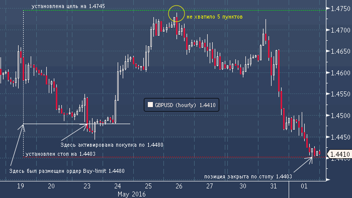 Фунт/доллар. Покупка от 23 мая по 1.4480 закрыта на 1.4403 (Stop-loss). Убыток 77 пунктов