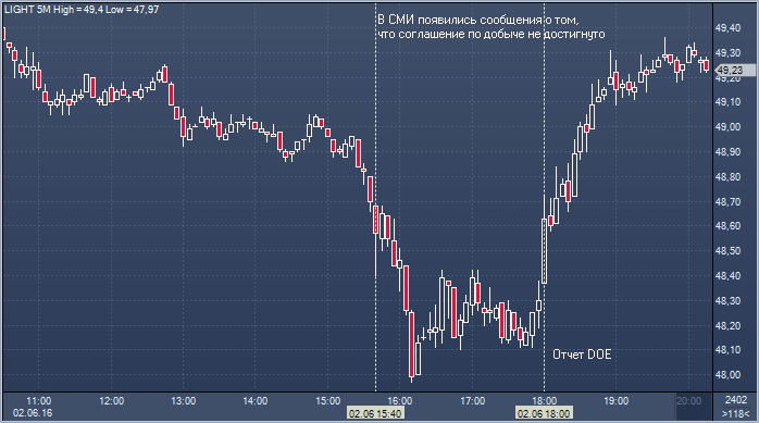 Разочарование спекулянтов обернулось падением цен к уровням вблизи $48, однако здесь было отмечено заметное усиление спроса, а отчет DOE вернул быкам былую уверенность. Снижение запасов нефти оказалось не столь ощутимым, как предполагалось, зато сокращение запасов бензина и дистиллятов превзошло прогнозы. Ключевым драйвером для возвращения цен к максимумам сессии, однако, стали новости о том, что добыча нефти в США продолжила падать и в неделю до 27 мая достигла отметки в 8.735 млн. баррелей в день — неплохой аргумент в пользу того, что стратегия ОПЕК действительно работает.   Источник: ProFinance.Ru - Новости рынка Forex