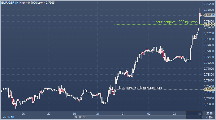 Валютные стратеги Deutsche Bank рапортуют о закрытии длинной позиции в евро/фунте по достижении заданной цели в 0.7850. Позиция была открыта 31 мая от 0.7630 со стопом на 0.7490 и принесла банку 220 пунктов прибыли.