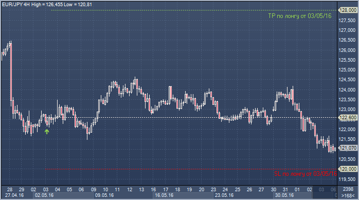 Евро/иена. 03 мая: лонг от 122.60, цель 128.00, стоп 120.00. Текущий результат -145 пунктов.
