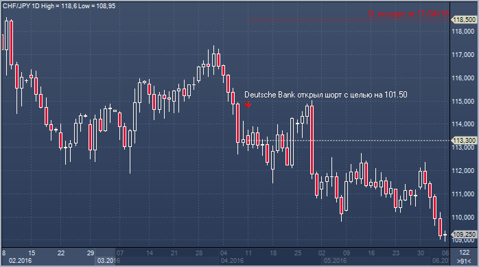 Франк/иена. 11 апреля: шорт от 113.30, целью 101.50 стоп 118.50. Текущий результат +397 пунктов. Источник: ProFinance.Ru - Новости рынка Forex