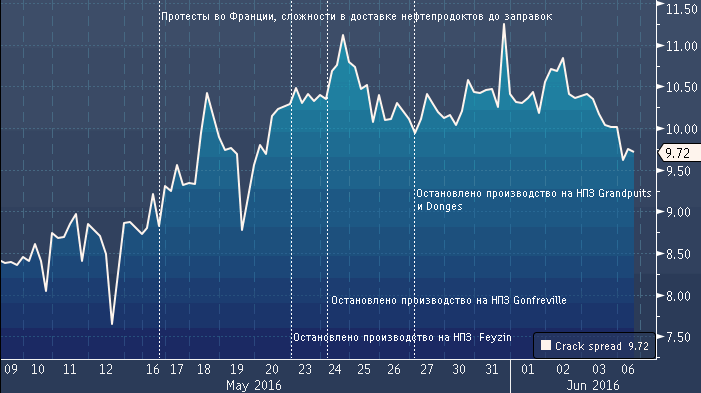 Трейдеры отмечают сокращение крэк-спреда (отражает разницу цен нефтепродуктов и нефти, индикатор маржи НПЗ) в Европе в последние пару дней. С приближением окончания заявленного срока забастовки напряженность ослабла, а после новостей о запуске процесса возобновлении переработки на НПЗ Feyzin, Grandpuits и Gonfreville, принадлежащих Total, крэк-спред сузился на пол доллара. НПЗ La Mede работает в обычном режиме, а вот НПЗ Donges продолжают блокировать около 30 рабочих. Трейдеры отмечают, что дальнейшее снижение спреда выглядит возможным, но полагают, что оно будет незначительным, учитывая сезонный рост спроса на дизель. Кроме того, сдерживающим фактором остается беспокойство относительно планов рабочих портов и доков Франции провести 24-часовую забастовку 9 и 14 июня. Проблемы в работе сохраняются на нефтяных терминалах Fos и Lavera. Рабочие в порту Le Havre проголосовали о продлении забастовки до среды. Источник: ProFinance.Ru - Новости рынка Forex