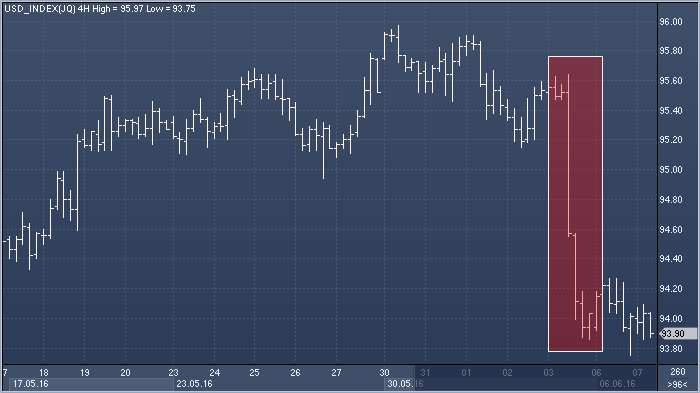 Пятничные цифры по NFP оказались седьмым в рейтинге самых масштабных «промахов» с 2001 года, а вот последовавший за их публикацией обвал Индекса доллара на 1.8% стал сильнейшей реакцией за тот же период. Этому макроэкономическому «сюрпризу» предшествовали согласованные вербальные попытки представителей ФРС настроить рынок на летнее повышение ставок на фоне улучшающейся статистики по США и ситуации за рубежом. Майское укрепление американской валюты, в основном, и было спровоцировано этими двумя факторами, однако теперь вероятность повышения ставок в самой ближайшей перспективе заметно снизилась, особенно, учитывая близость референдума по вопросу «Брекзита». В пятничном отчете по рынку труда было мало хорошего, однако мы не уверены, что это означает широкомасштабное замедление экономики США и, следовательно, что подобный радикальный пересмотр ожиданий действий FOMC обоснован. В любом случае, исторически движения доллара после негативного сюрприза по NFP носят устойчивый характер, поэтому в краткосрочной перспективе мы остаемся медведями по американской валюте. Однако если макроэкономическая статистика по США останется сильной, мы вернемся в длинные позиции. Источник: ProFinance.Ru - Новости рынка Forex