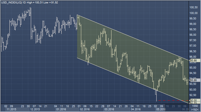 В последние сессии американская валюта дешевеет по всему спектру рынка, и Индекс доллара имеет все шансы проверить на прочность минимумы начала мая около 92.00. Во вторник в США будут опубликованы данные по розничным продажам, которые могут оказаться слабыми, а текущая позиция ФРС в лучшем случае нейтральна для доллара. На ближайшем заседании FOMC оценка ситуации на рынке труда, скорее всего, будет пересмотрена в сторону ухудшения (учитывая недавние разочаровывающие данные). К тому же, 23 июня состоится референдум по вопросу «Брекзита», и мы не видим смысла для Комитета создавать дополнительные риски, намекая на то, что ставки могут повышены на заседании 27 июля. Источник: ProFinance.Ru - Новости рынка Forex
