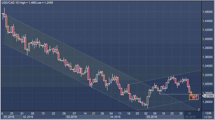 В своих технических комментариях от 8 июня (среда) мы рапортовали об успешном достижении цели на 1.2725, рекомендовали сократить короткие спекулятивные позиции и рассмотреть возможность покупки. Сейчас мы видим целесообразность внести некоторые коррективы в наши рекомендации. Дело в том, что 3 торговых дня цены в паре доллар/канада остаются «зажаты» в 100-пунктовом диапазоне между 1.2750 и 1.2650.