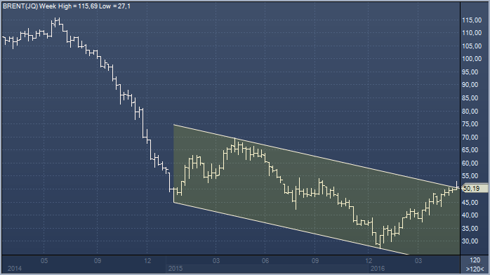 В январе/феврале этого года цены на нефть достигли многолетних минимумов ниже $30 и с тех пор без оглядки растут. В последние сессии и Brent, и WTI флиртуют с отметкой $50, заставляя все большее количество экспертов говорить о том, что дно в текущем цикле уже сформировано. Восстановление цен на черное золото объясняется главным образом изменениями на стороне предложения. Так, с начала года объем добычи в США сократился примерно на 0.5 млн б/д, что привело к замедлению темпов роста запасов, которые, впрочем, продолжают оставаться высокими по историческим меркам (на 30% выше среднего значения за последние пять лет), что означает наличие необходимости дальнейшего сокращения объема добычи для приведения рынка в состояние баланса.