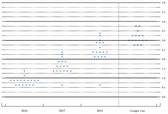 Как мы и ожидали, Комитет отметил рост деловой активности в период между заседаниями, особенно это касается расходов домохозяйств. Слабость рынка труда была довольно обтекаемо охарактеризована, как «замедление темпов улучшения», и также был дан оптимистичный прогноз относительно ожидаемого улучшения ситуации. Что более важно, кривая «точек» (ProFinance.ru: ожидаемых членами FOMC уровней ставок на разных временных горизонтах. См. картинку внизу) заметно сгладилась. Мы ждали снижения среднего уровня «точек» на 2017, 2018 годы и более отдаленную перспективу на 0.25%, однако прогноз на 2018 год был понижен еще сильнее. В целом, оптимистичный тон Заявления, оставляющий дверь для повышения ставок в июле-сентябре открытой, был нейтрализован снижением «точечного» прогноза.