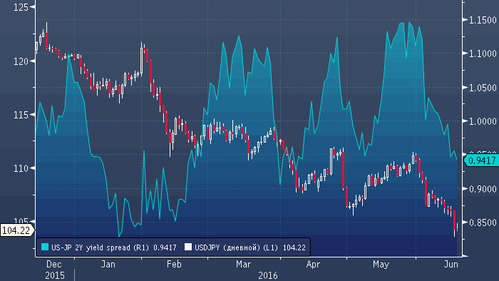 Динамику доллар/иены сложно назвать позитивной, и у пары есть весьма веские причины для того, чтобы торговаться с подавленным настроем. Внимание участников рынка остается приковано к продолжающему сужаться спреду доходности американских и японских облигаций. Еще в конце мая спред по 2-летним бумагам держался у долгосрочных максимумов в районе 1.145%, однако публикация отчета по рынку труда США нанесла сокрушительный удар: спред сократился с 1.12% до 1.00%, а в последующие дни они медленно, но уверенно продолжил сужаться и в настоящее время держится у минимальных уровней с конца марта/начала апреля в районе 0.937%. Стоит отметить, что сегодня его сужение в значительной степени обусловлено восстановлением доходности по японским бумагам, которая в данный момент составляет -0.249%. Кроме того, примечательно, что в последние месяцы его рост был неспособен стать катализатора для роста доллар/иены и играл роль фактора, сдерживающего укрепление японской валюты. К сокращению дифференциала доходности рынок, между тем, был чувствительней.