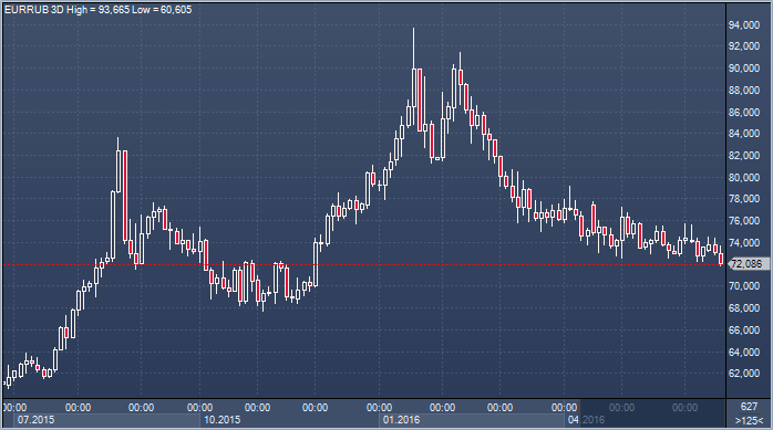 Доллар/рубль сохраняет тягу ко вчерашним минимумам и в данный момент держится в районе 64.06. Между тем, евро/рубль сегодня пусть немного, но обновил, многонедельные минимумы: пара достигла отметки в 71.908, что стало минимальным значением с середины ноября 2015. Настрой в паре остается подавленным, а техническая картина указывает на рост рисков развития нисходящей динамики. Обвала ждать не приходится, но постепенное сползание курса в область 70 — 68 видится вполне реалистичным сценарием, и убедительный прорыв поддержки в районе 72 будет тому подтверждением.