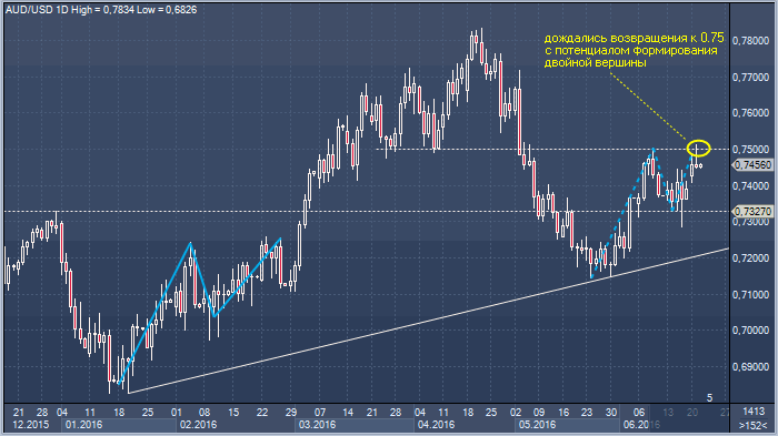 Мы предпочли бы воздержаться от торговли в связи с референдумом в Великобритании, который является сильным источником излишне высокой и истеричной волатильности. Мы не любим такую волатильность, поскольку не очень понятно где в таких условиях ставить стоп (для нас это важнее цели). Но если все же игнорировать эффект референдума, то логично попытки вернуться выше 0.7500 использовать для продаж, но стоп следует расположить не ниже 0.7640.