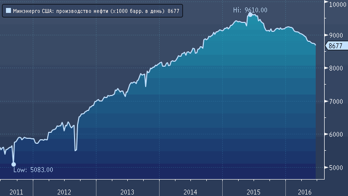 В течение прошлого года многие мелкие компании, занимающиеся гидроразрывом, обанкротились. Но ни одна компания, объемы добычи которой выше 100 тыс. б/д, не начала процедуру банкротства и все они остаются на плаву. Это, кстати, объясняет, почему на фоне реализованного ранее падения цен на нефть общий объем производства нефти в США с максимума в апреле 2015 года на уровне 9.69 млн. баррелей сократился всего на 10%.
