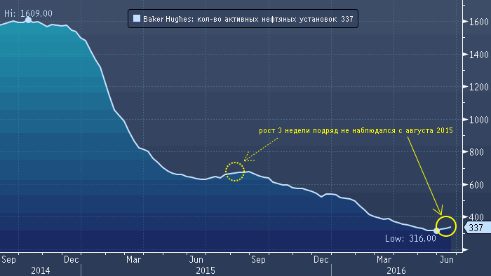 Ранее весь цикл сокращения объемов добычи сланцевой отрасли сопровождался уменьшением числа активных буровых установок, которые с максимума октября 2014 года (1609 установок) упали до 316 установок в конце мая этого года. Но за последние 3 недели количество активных нефтяных установок выросло на 21 до 337 штук. Стоит отметить, что 3 недели роста показателя к ряду не наблюдалось с августа 2015 года.