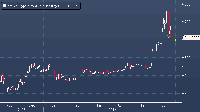 За последние шесть дней цена биткоина на торгах электронной бирже Kraken упала более чем на 20% из-за ожиданий участников рынка, что по итогам референдума в Великобритании страна останется в составе ЕС. Первоначальный рост цен на криптовалюту произошел на фоне роста спроса на безопасные активы, к которым приравнялся биткоин. Опасения Brexit привели к активному увеличению стоимости криптовалюты, однако появившиеся позднее данные соцопросов, показавшие рост голосов за сохранение членства Великобритании в ЕС, привели к резкому падению стоимости биткоина. «Я думаю, что это в первую очередь макроэкономические события, как Brexit, повлияли на торги. Вы видели, что цены меняются, видели, что опросы общественного мнения показывают рост голосов за Brexit, и как те же опросы показали обратное на минувшей неделе», — рассказал телеканалу CNBC сооснователь стартапа по технологии blockchain Elliptic Том Робинсон.