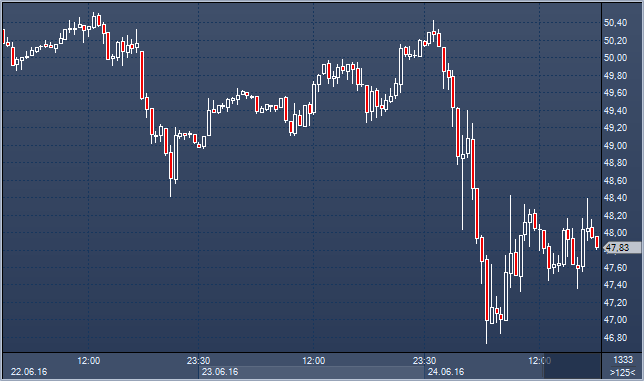 Нефтяной рынок всем своим поведением как-бы говорит нам: а нам все равно — Brexit там у вас или не Brexit, у нас здесь аптренд и точка. Падение нефти в реакции на тот исход референдума, который мы получили, оказалось чуть меньше, чем мы вчера прогнозировали (10%), и, скорее всего, такая прохладная реакция говорит о том, что влияние рефернедума на сырьевой рынок на следующей неделе может сойти на нет. Сейчас паника на финансовых рынках немного утихла, власти разных стран обещают в случае чего предоставить ликвидность в своих валютах, намекают на проведение интервенций на валютном рынке, а ШНБ сегодня ее уже провел.